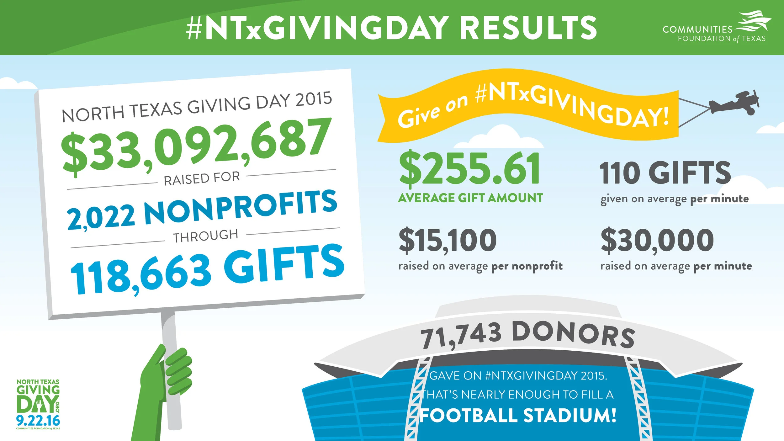 The North Texas Giving Day, annual one-day event, on September 22nd, 2016. This even promotes North Texas non-profits and provides a way to see your practice of giving increased. They percentage match every gift of $25 or more to the non-profit of your choice that is accepted and participates in the event.